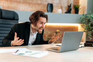Irritated angry caucasian business man, stock trader, product manager, working in a modern office, yelling to the laptop, frustrated by the disruption of an important deal, financial losses, upset